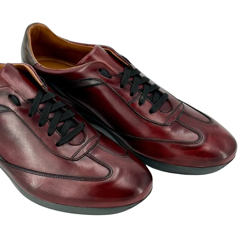 Handcrafted sneakers in burgundy leather with gray inserts.