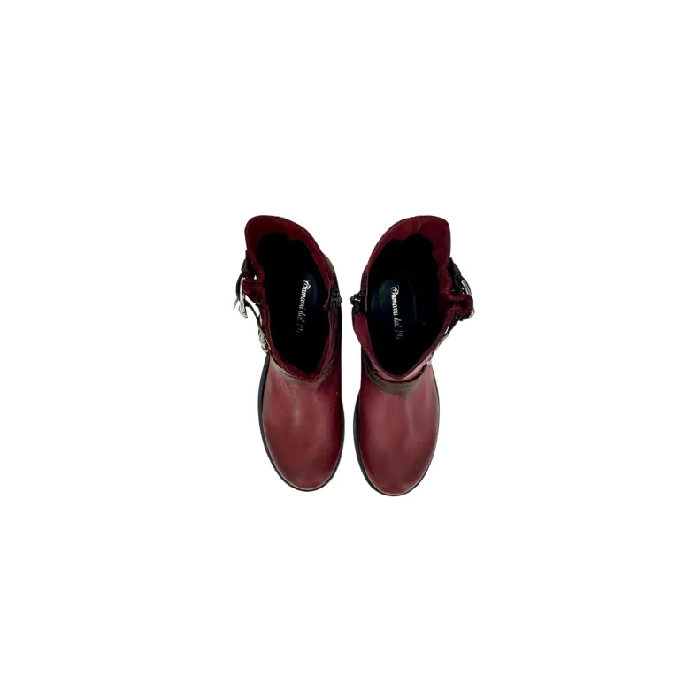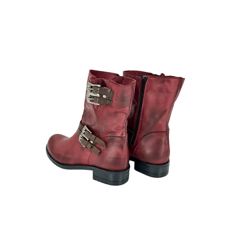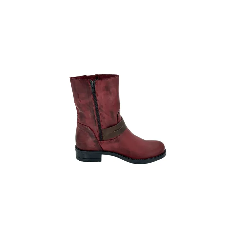 Burgundy leather boot with brown leather details.
