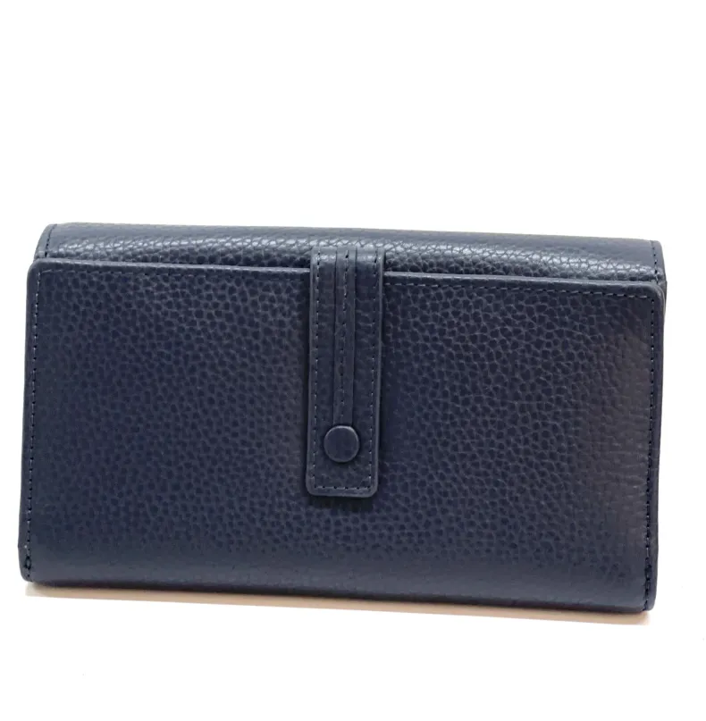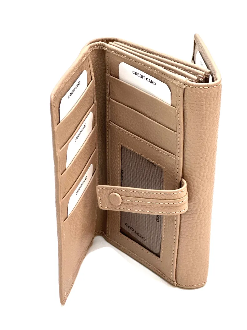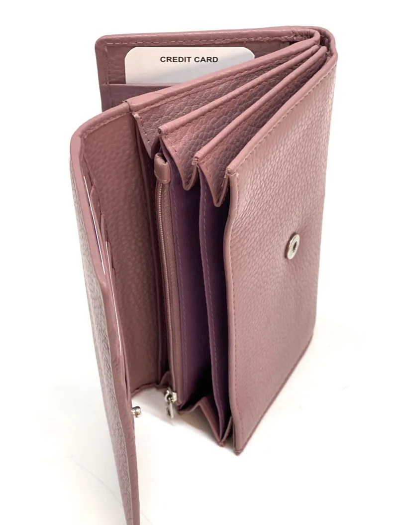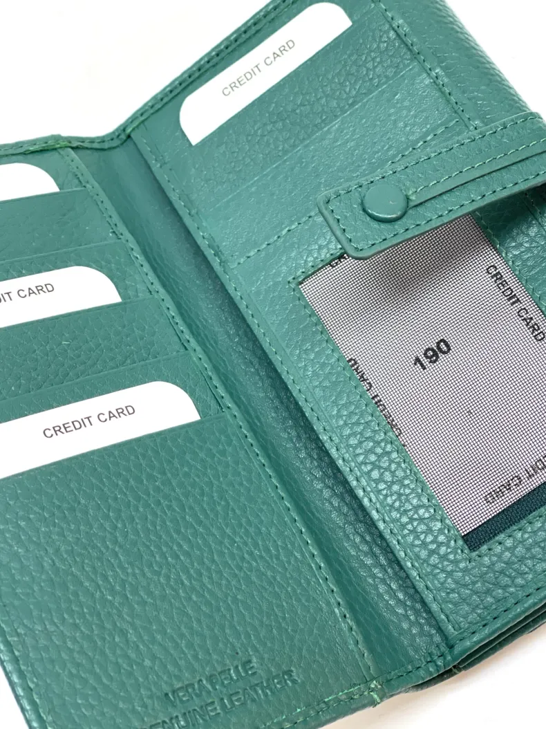Made up of 2 parts: 3 spaces for cards/discredit cards, a transparent space for documents, 4 pockets for banknotes etc. divided by a coin pocket closed by a zip.