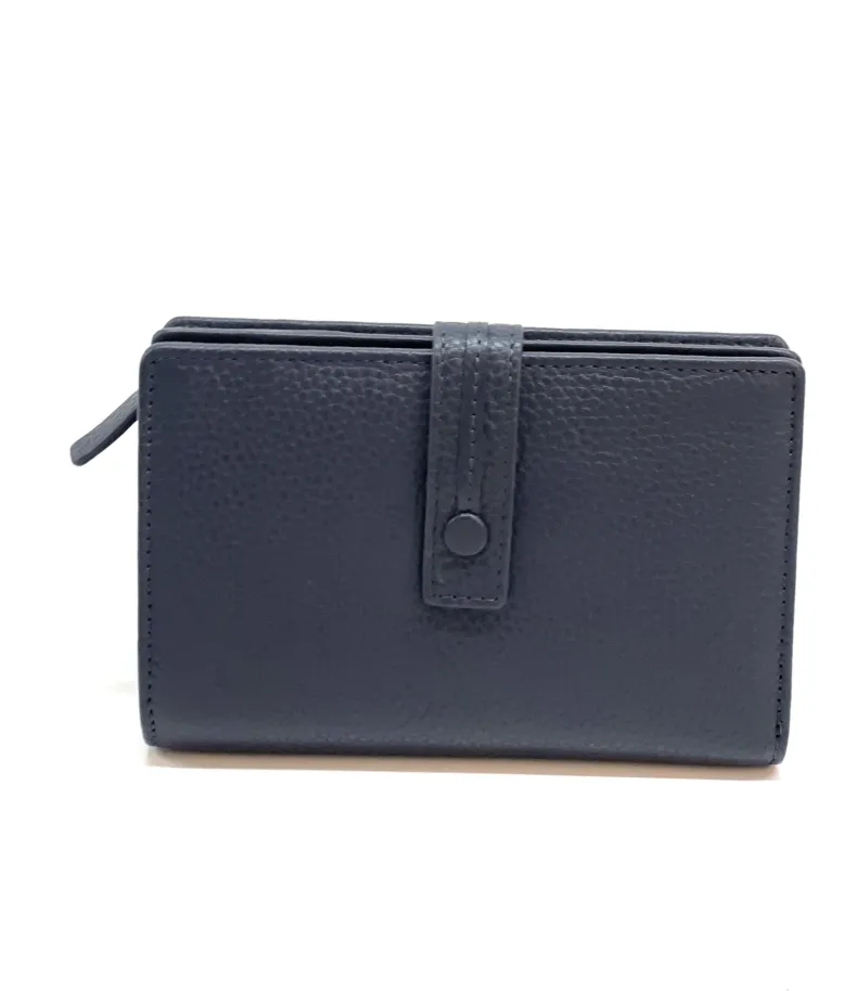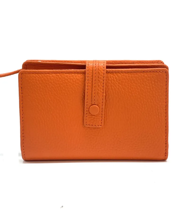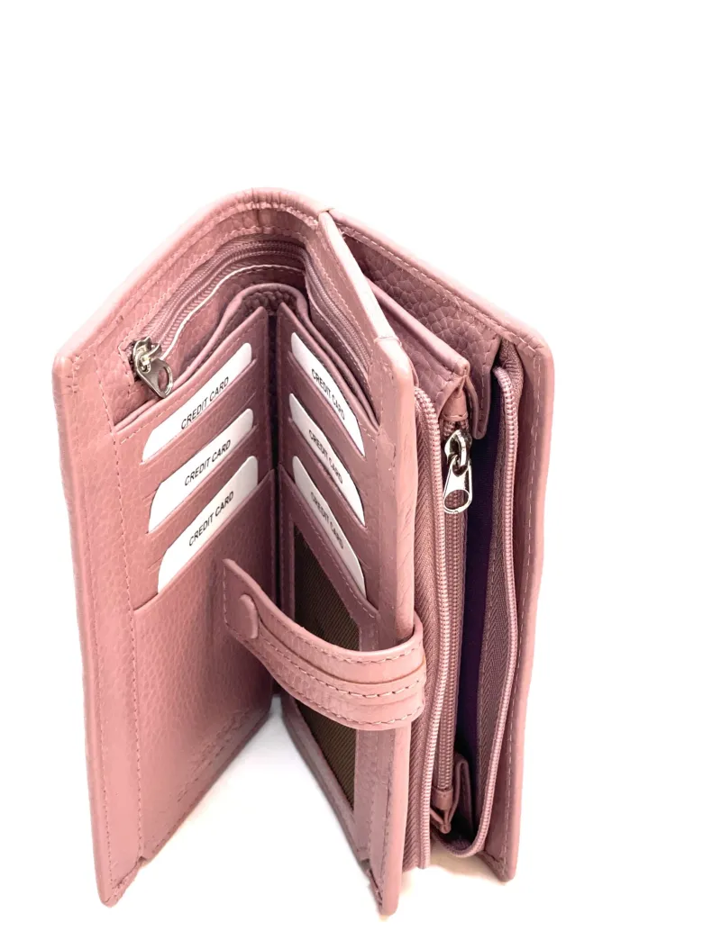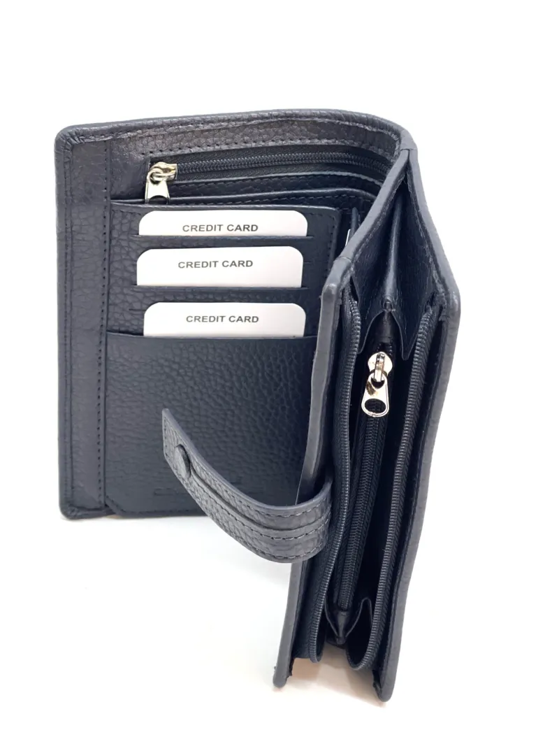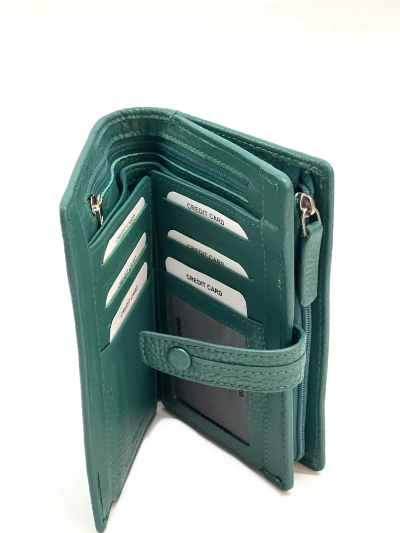Part with button equipped with: 9 card/credit card holder spaces, 1 banknote holder space, 1 zippered pocket, 1 transparent document holder space.