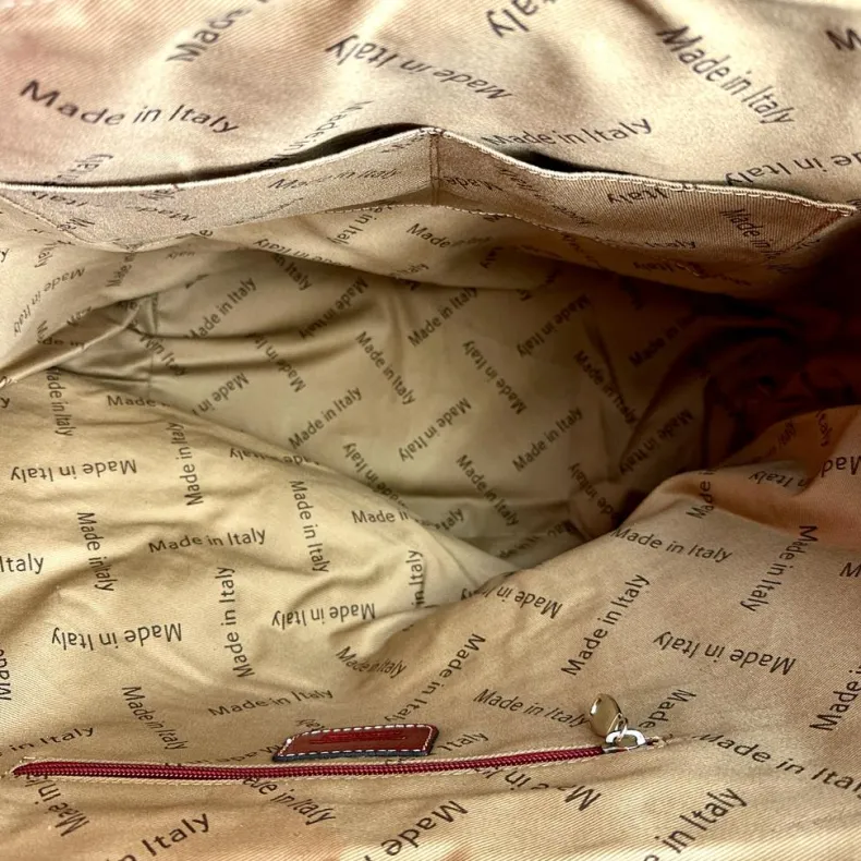 Inside it has a single compartment with a pocket closed by a zipper and two open pockets.