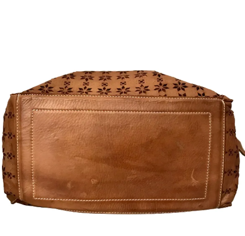 Laser-cut leather with floral print on both the front and back.