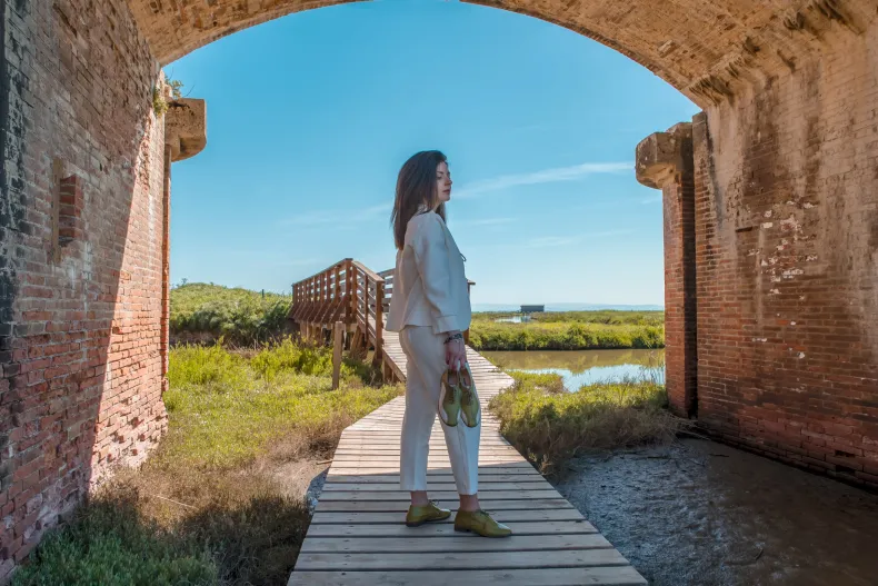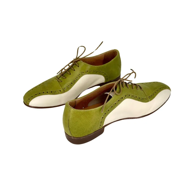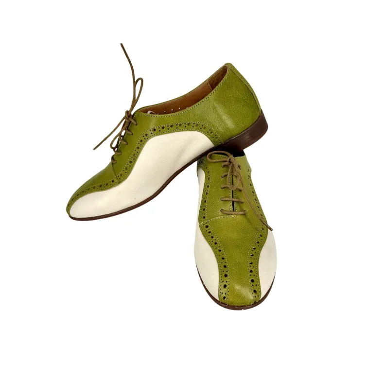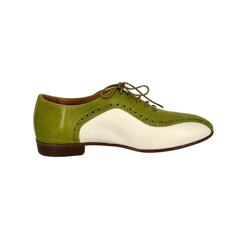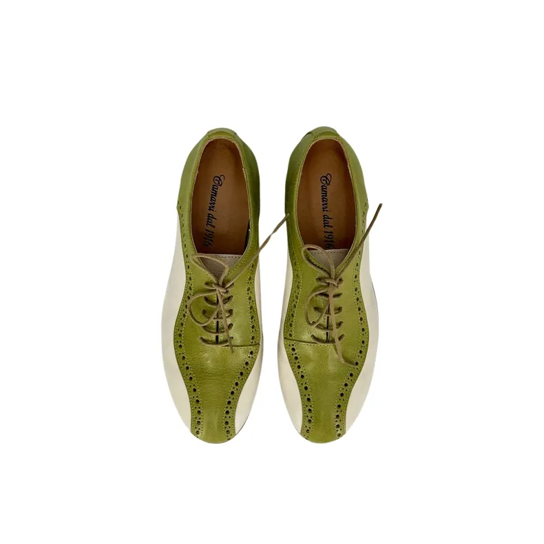 Handcrafted shoe in ivy green and off-white dipped leather.