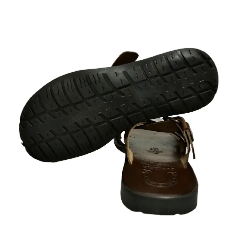 Handmade slipper in dark brown cowhide with adjustable buckle bands.