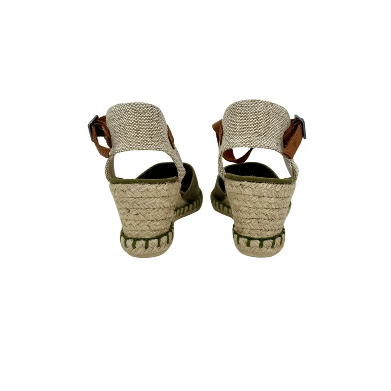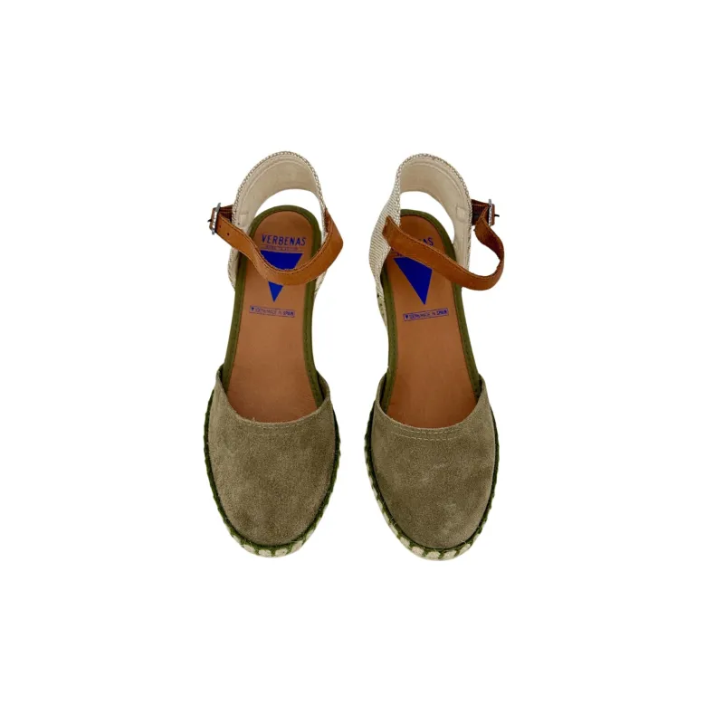 Summer wedge in khaki suede, espadrilles model closed at the toe with ankle fastening.